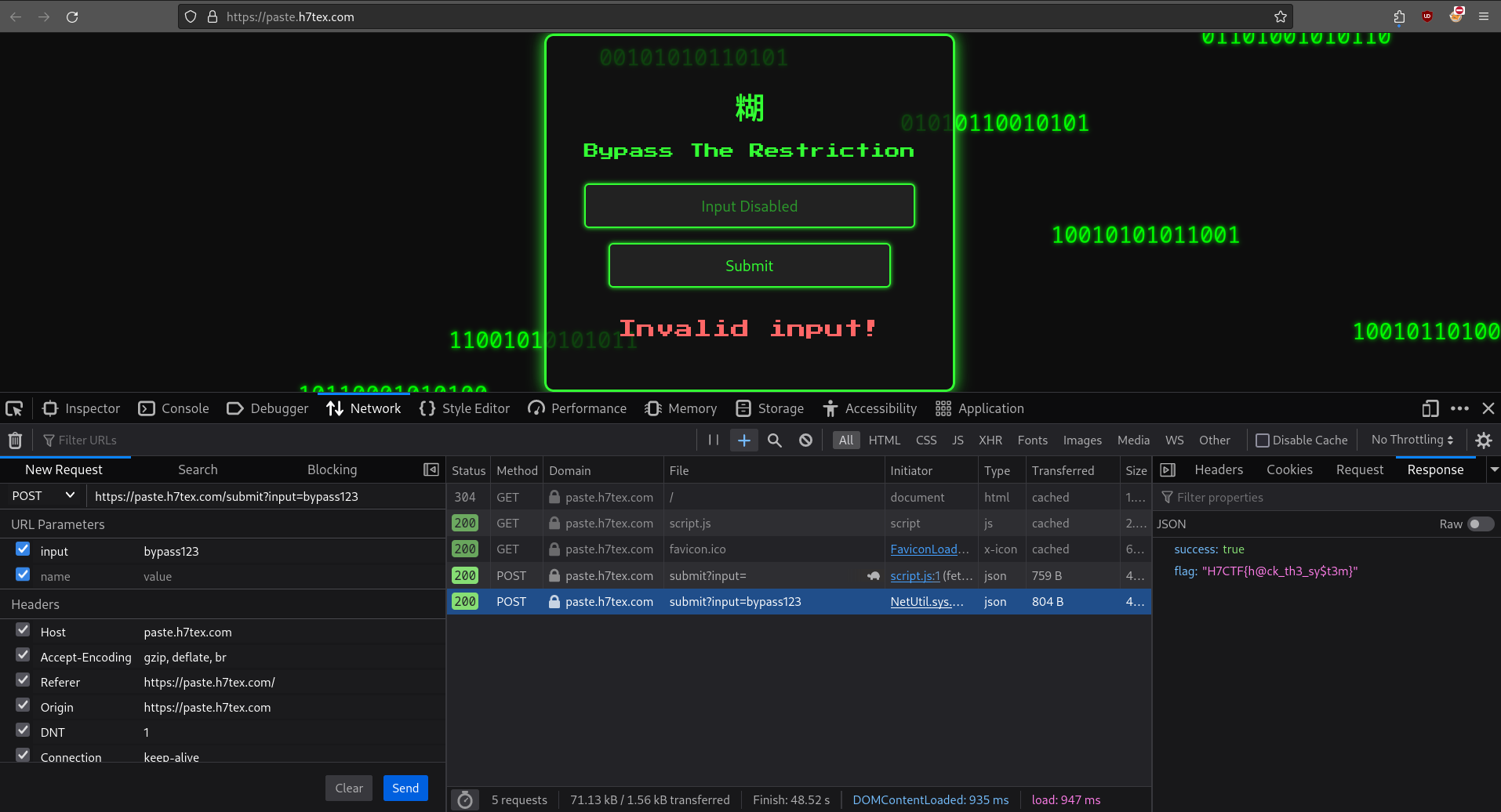 In this challenge, we have a webpage with an input box that is disabled (it stops the user from writing anything in it) and a submit button. If we click the submit button we get a message saying Invalid input!, so we need to find a way to bypass this restriction and send a valid input. Using the browser devtools, it is possible to see the requests made by the application.