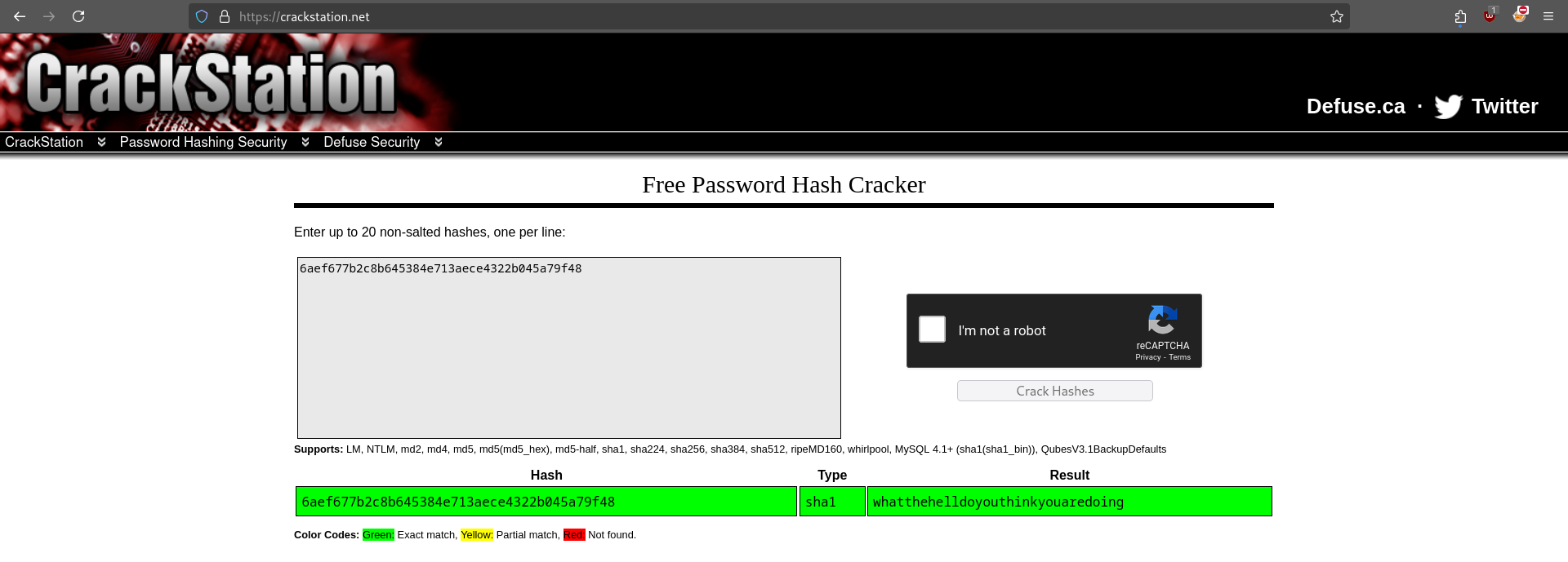 The comment hints to carefully look into the keys used to perform the encryption and decryption. The first thing we tried was using the variable D value 6aef677b2c8b645384e713aece4322b045a79f48 as the key to decrypt the trap file contents. After a few failed attempts, we finally realized that the D variable value was actually a sha1 hash that we needed to crack in order to retrieve the real key. Let’s use crackstation to crack the key.