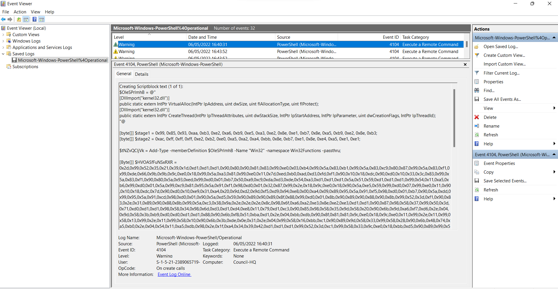In the description of one of the warnings in the Microsoft-Windows-PowerShell%4Operational.evtx file we have a powershell script that was created to run some code.