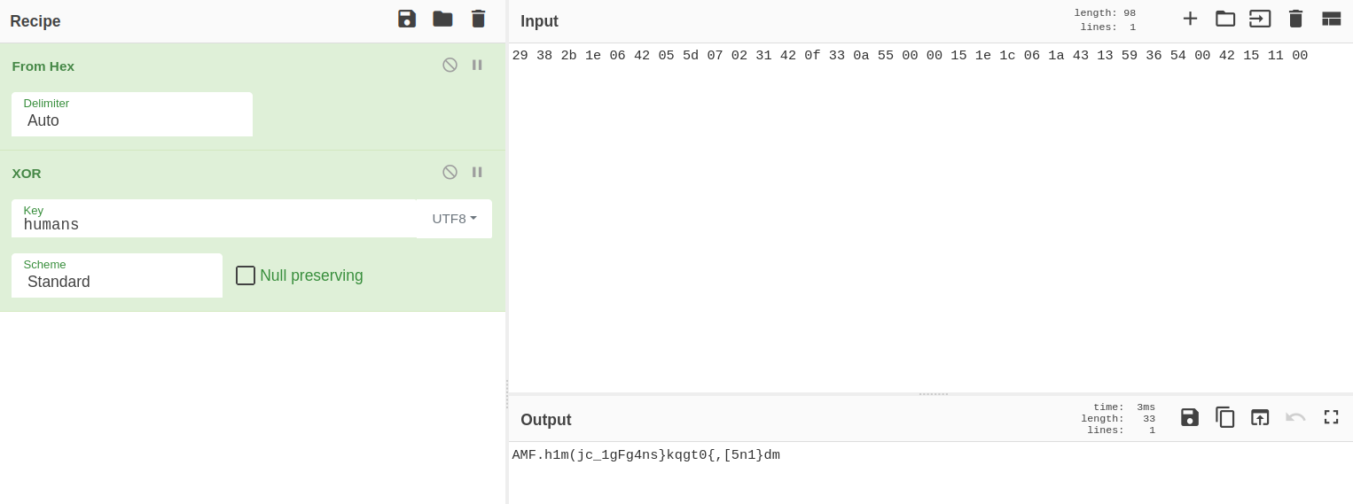 Now we go to CyberChef and use the key humans to try to decode the hex string extracted earlier.