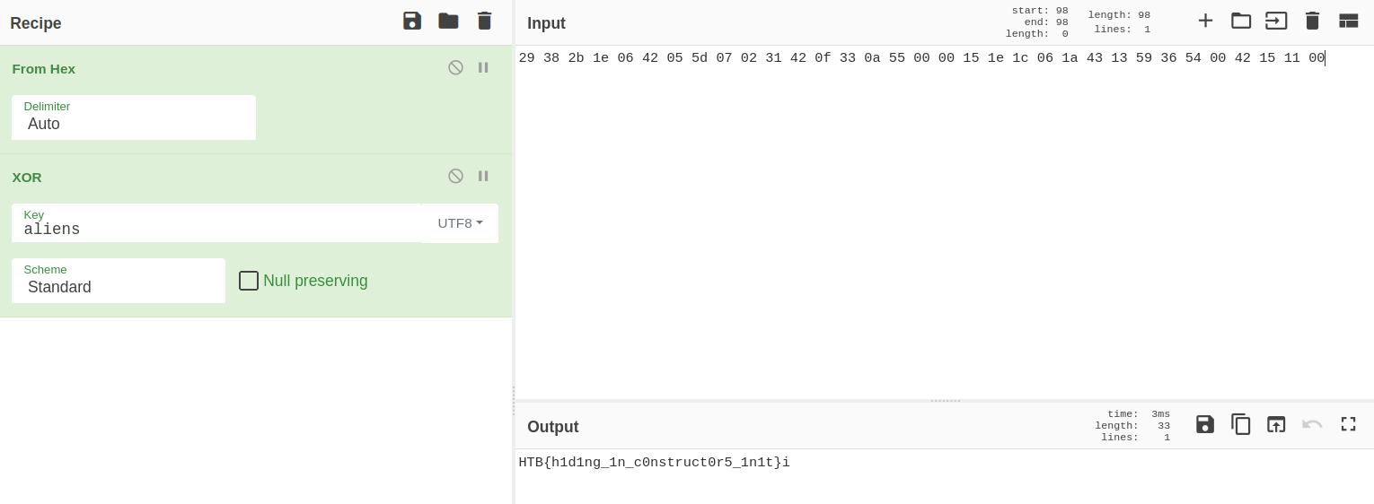 Go to CyberChef again and use the key aliens to decode the hex string.