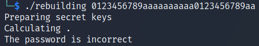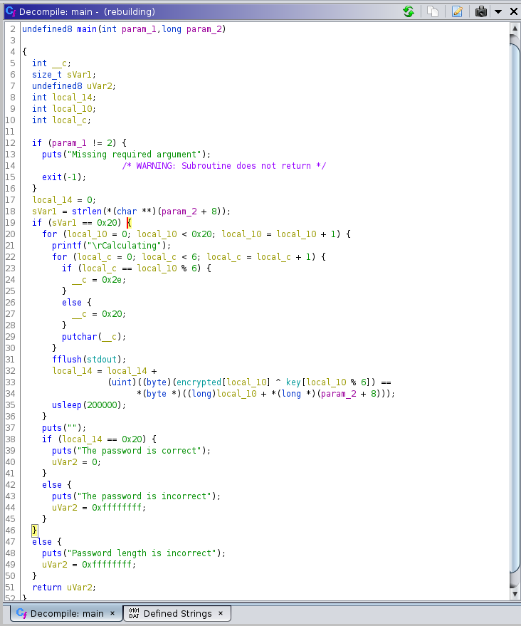 The program takes a few seconds Calculating and then returns The password is incorrect. Let’s go back to Ghidra.