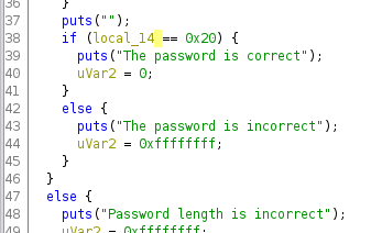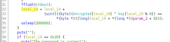 In line 38 of the main function we see a conditional statement that check if (local_14 == 0x20) the program outputs The password is correct.