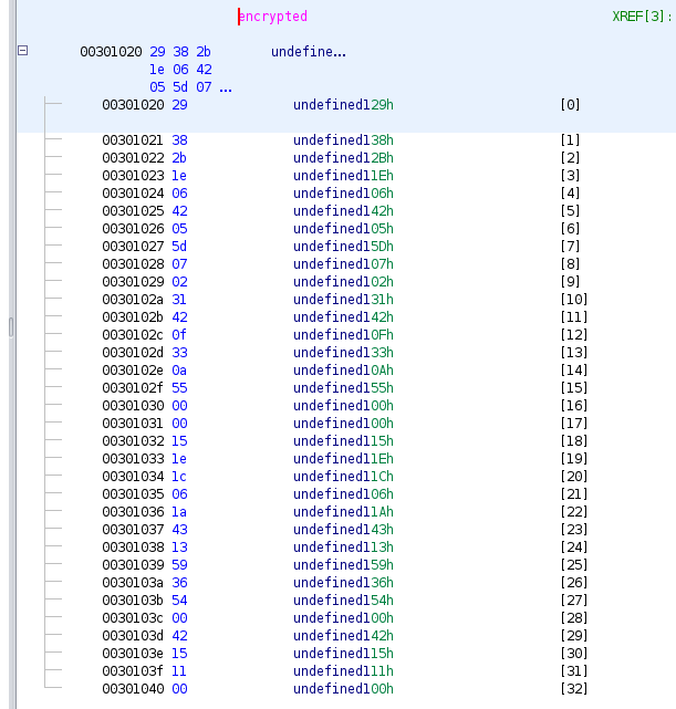 When we double click on DAT_00303281, Ghidra takes us to the following part in the listing section: