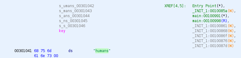 Going back to the main function, by clicking on key we are able to view the string humans that supposedly is used as a key to XOR the hex string above and decode the data.