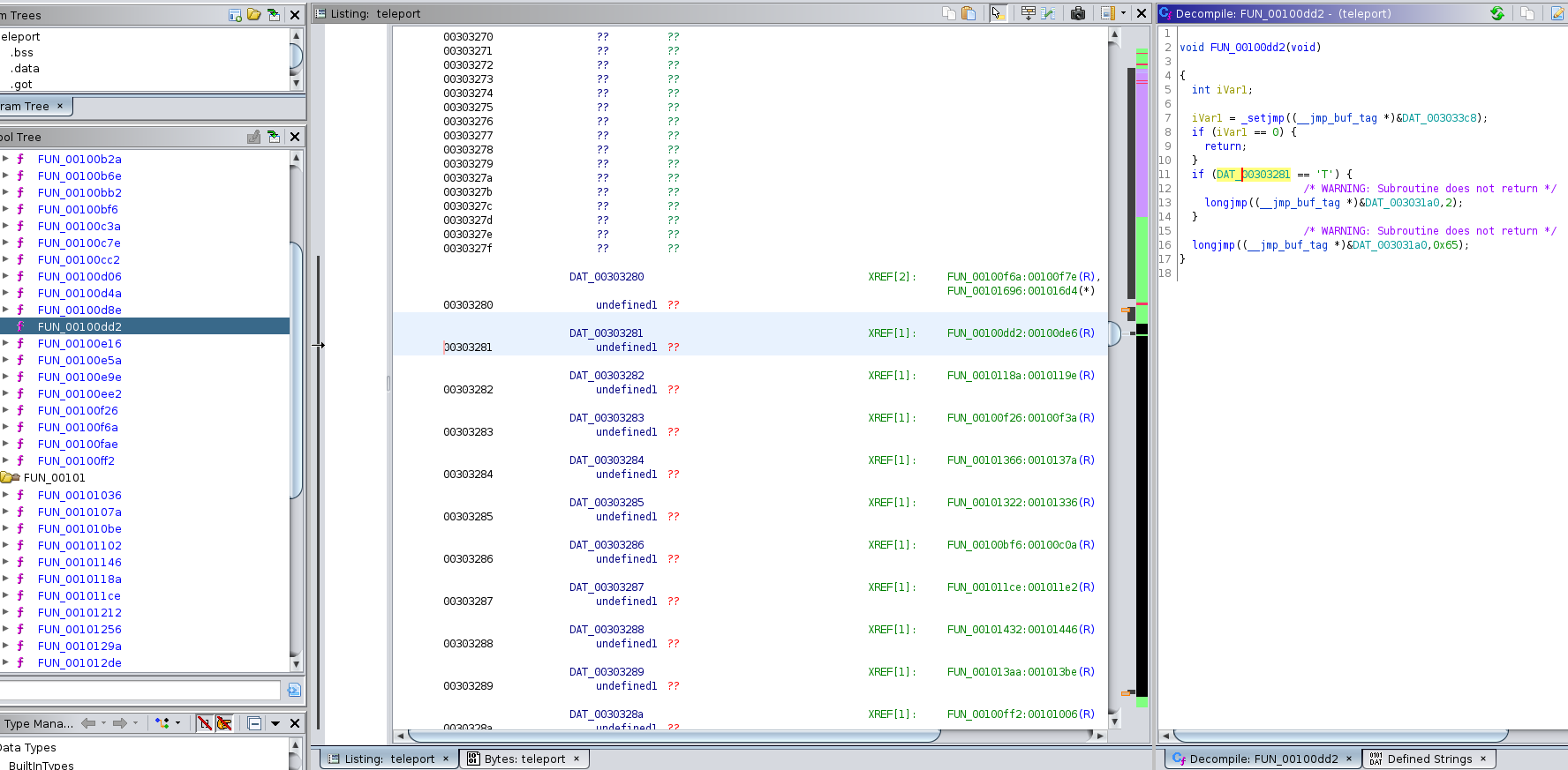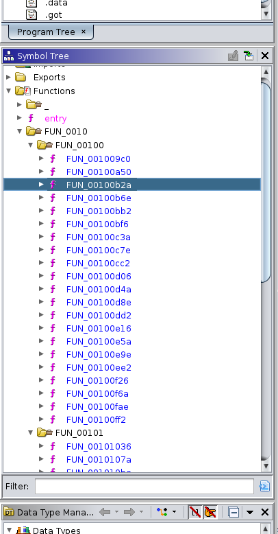 To start our analysis we go to the Symbol Tree section in Ghidra where we can see all the functions.