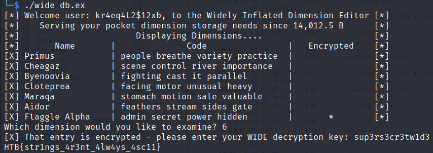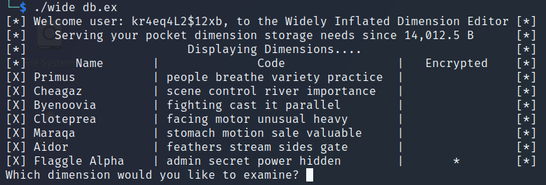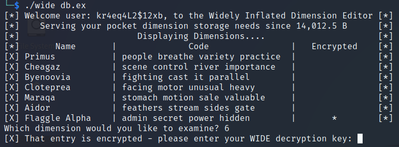 By selecting the dimension number 6 (Flaggle Alpha), the program asks us for the WIDE decryption key.