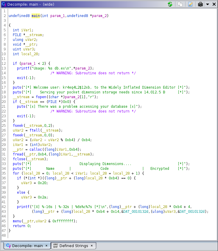 After opening wide in Ghidra and selecting the main function, let’s go to the decompiler section to see if we can find some useful information.