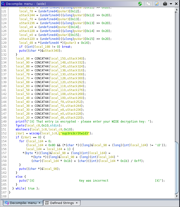 Looking at the function menu, we can see that in line 152, a string comparison is being made using wcscmp to see if our input matches the string sup3rs3cr3tw1d3. So now let’s input the string sup3rs3cr3tw1d3 when the program asks us for the WIDE decryption key.
