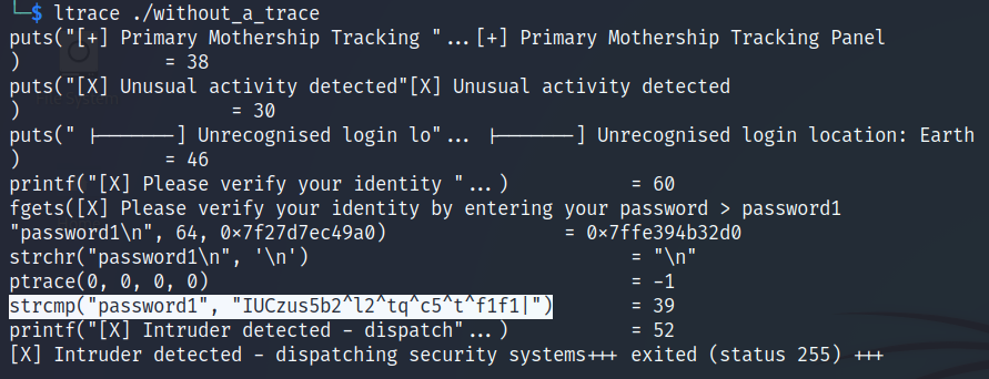 With ltrace we can see a string comparison the program makes between our input (password1) and the string IUCzus5b2^l2^tq^c5^t^f1f1| to check if the password is correct.