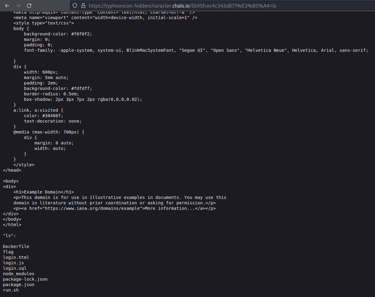 Executing the ls command with: https://typhooncon-hiddencharacter.chals.io/5b95fcec4c343d87?%E3%85%A4=ls returns the following response: